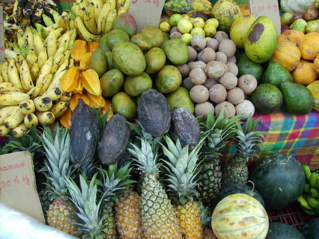 Fruits de la passion, goyaves, mangues, caramboles, noix de coco, bananes fressinettes, citrons verts sont un peu plus connus chez nous mais il reste des surprises : l'ananas-bouteille, les sapotilles, le corossol ou les surelles dont on fait des sirops ou de la confiture. Ce n'est pas la saison des abricots-pays, des prunes de cythère et des pommes cannelle mais nous y avons goûté cet été. Les pamplemousses et oranges ont un aspect plus rustique que dans nos supermarchés mais ils ont un goût délicieux. J'ai même vu des fèves de cacao et des fruits de caféyer.