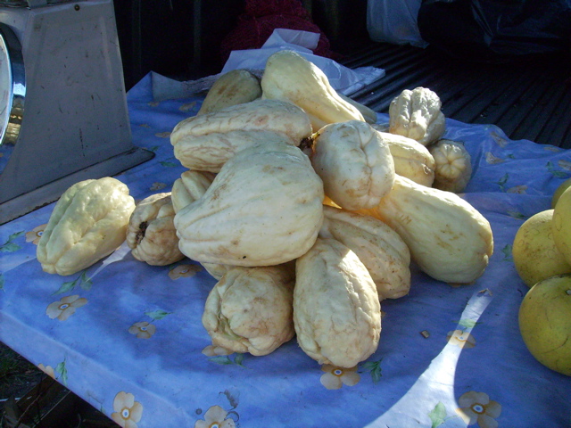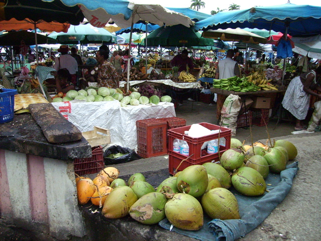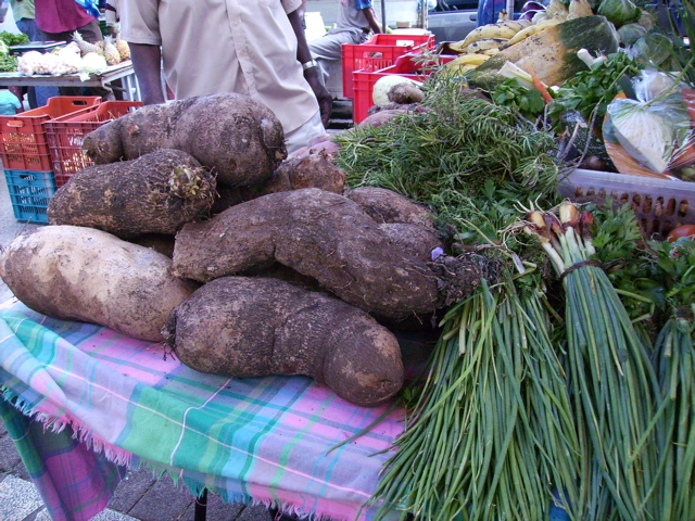 On y trouve bien sûr des choux, des carottes, des tomates et des concombres mais il y a aussi toutes sortes de racines, ignames, patates douces, malanga, dachine qui se cuisinent comme la pomme de terre. C'est le feuillage le plus tendre de la dachine sert à faire la délicieuse soupe nommée "calalou". La christophine, qu'on cuisine crue ou cuite, en salade ou en gratin s'appelle aussi chaillotte. C'est un peu le problème ... quand on demande le nom d'un légume, on a le nom local, qui différe même parfois d'une île à l'autre. Si tu veux des aubergines, il faut demander des bélangères (avez-vous eu des antillais à Givrins ? vous avez le chemin de la Bélangère). Ce que j'appellerais crone, ils l'appellent "safran". Les courges ont pour nom "giraumon". Ce matin, j'ai encore découvert un légume que je n'avais jamis vu, appelé ici "pikenga", sorte de concombre.