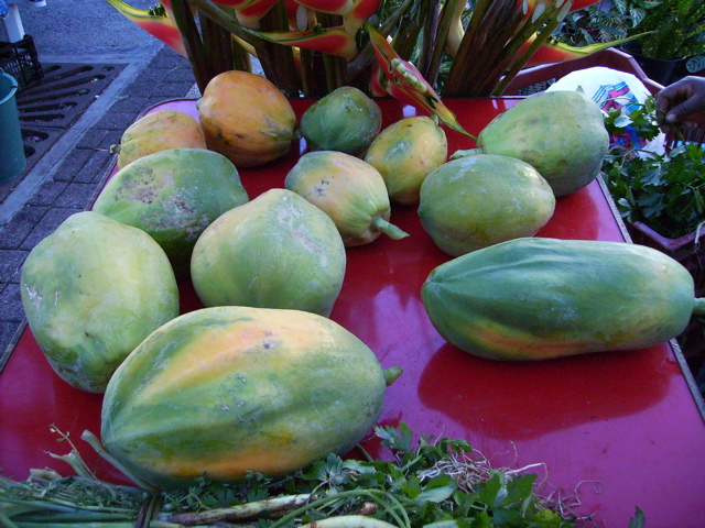 On trouve beaucoup de fruits-légumes comme le fruit à pain. Les plants ont été amenés depuis la Polynésie par le capitaine Bligh sur la Bounty. Il préférait les arroser que de donner à boire à ses marins, ce qui a provoqué une mutinerie. L'arbre à pain a un feuillage magnifique et les fuits sont énormes. Ils peuvent être bouillis, rôtis, frits, cuits en salade ou en gratin... mais ils sont très gluants. On pourrait presque en faire de la colle. Je suis certaine que tu n'hésiterais pas à en faire l'expérience ! La banane-plantain est aussi un légume qui se cuisine de beaucoup de manières et qu'il ne faut pas confondre avec les bananes-dessert. La papaye verte se fait en gratin alors qu'elle est consommée comme un fruit quand elle est mûre. Les avocats sont énormes et succulents.