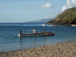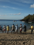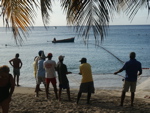 Pour annoncer le pêche, ils soufflent dans un lambis (un gros coquillage). Les hommes du village accourent (pas trop vite tout de même... mais "amarchent" n'existe pas). Une barque leur amène les cordes rattachées aux extrémités du filet, de chaque côté de la plage, puis va larguer le filet au large, en travers de la baie. Une fois le filet posé, les hommes commencent lentement à le ramener. Les touristes ont le droit de donner un coup de main. Bonjour les cloques ! D'autant qu'on ne tire pas que le filet mais les cailoux qui sont sensés le maintenir au fond. Après 300 m de corde, le filet apparaît et se resserre. On tire alors sur la base en même temps. Finalement, l'espace se restreint et on devrait voir frétiller ou même sauter les poissons...