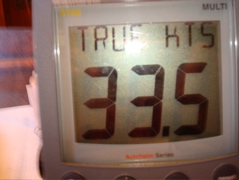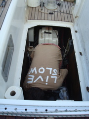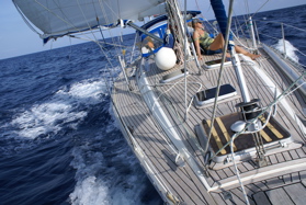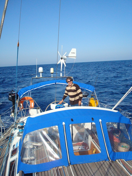 Nouvelle capote, nouveau bimini et surtout nouveau portique, grande modification de cet hiver. Il a été testé d'entrée lors d'une traversée mouvementée entre Syracuse et Zakynthos en Grèce, 280 nm avec vent de 5-6 Bf et vague de travers. De droite à gauche... l'éolienne a résisté et a bien compensé l'énergie utilisée par le pilote automatique, le Wavefinder (au milieu) était à l'affût si nous tombions à l'eau, les antennes satellite (iridium et mini-M) nous ont permis de prendre la météo et, tout à gauche, l'antenne VHF de l'AIS nous a donné la position des cargos, leur nom, leur vitesse et leur route.