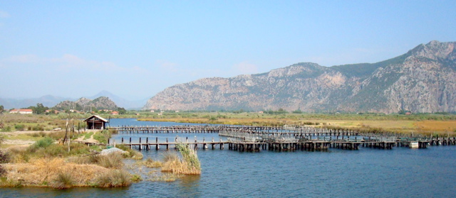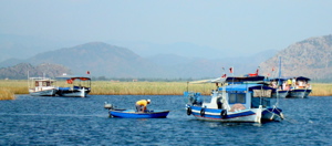4 août 2008 : Changement de bateau et changement de paysage pour cette balade de quelques heures dans le delta de la rivière qui mène à Dalyan et à l'antique Caunos. Le "dalyan" est en fait un piège à poissons, comme un barrage, qui ferme un bras de la rivière envahie par les roseaux. A l'embouchure se trouve une grande plage où les tortues caretta-caretta vont pondre de mai à septembre.
