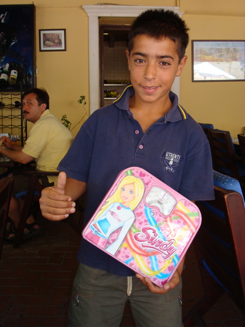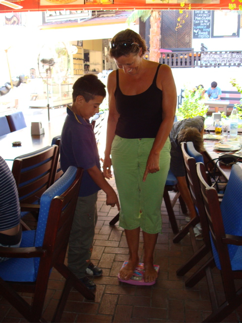 27 juillet 2008 : Au lendemain de mon anniversaire, c'est peut-être le moment de me peser ! Sans balance sur le bateau, je profite du passage de Serhat. Comme beaucoup d'autres garçons en Turquie, il se promène avec sa balance sous le bras pour se faire quelques sous... mais n'a pas beaucoup de succès ! Avec les excès des vacances, les touristes préfèrent ne pas savoir !