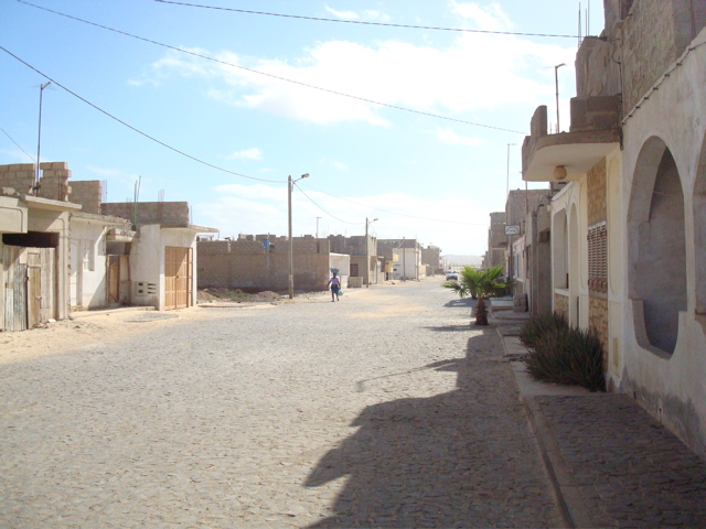 17 décembre 2008 : Une rue de Sal Rei sur Boavista. On ne peut pas montrer que les "jolies images"... La réalité, c'est aussi cette grisaille, les habitations en chantier perpétuel, le sable et la poussière partout. Le touriste qui est en nous aimerait ne voir que que l' "authenticité", la vie "proche de la nature", "comme autrefois". Le Cap Vert se développe rapidement (ou du moins le tourisme au Cap Vert). A Sal Rei, ils construisent des fontaines pour enjoliver le village alors que les femmes vont chercher l'eau au camion citerne ! C'est impossible de juger de ce que cette évolution amènera mais on constate plus de petite délinquance dans les îles les plus développées. Pour l'instant, Boavista semble épargnée et on peut laisser son annexe sans problème sur la plage.