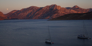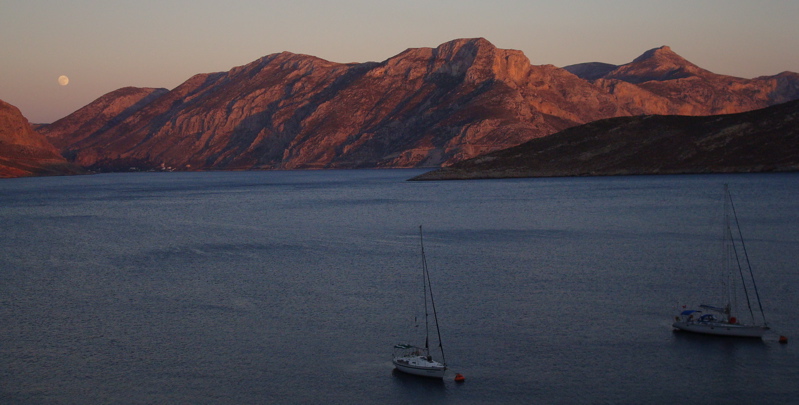 24 juin 2008 : Nous avons vécu un moment inoubliable lors de la dernière pleine lune : attablés à une terrasse de taverne au-dessus du mouillage d'Emborios, sur Kalymnos, nous regardions Anegada à nos pieds et les montagnes s'embraser au coucher du soleil quand la lune est apparue. Moment magique !