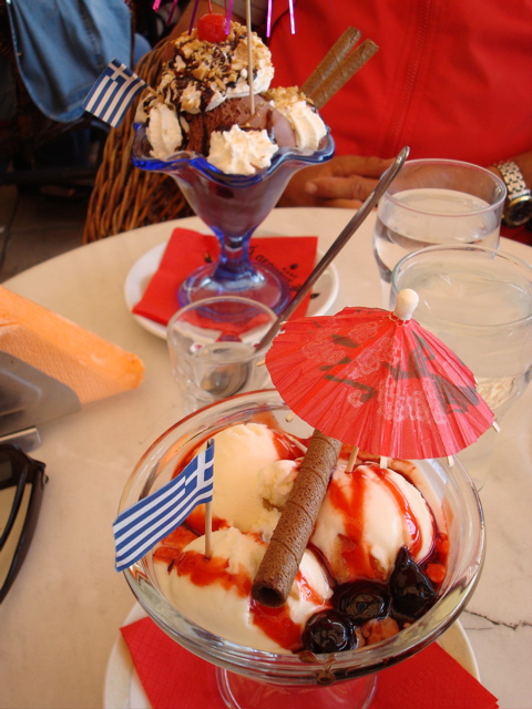 Ouf ! On a bien mérité une bonne coupe glacée sur la terrasse d'un café d'Egine.