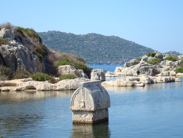 21 juillet 2008 : Nous découvrons les superbes sarcophages lyciens de la baie de Kekova et ses cités englouties dans des eaux transparentes. Les tombeaux et sarcophages sont éparpillés autour de deux villages semblant vivre encore comme dans un autre temps bien que, ou plutôt parce que des hordes de touristes viennent chaque jour les visiter. Décalage un peu étonnant mais accueil très sympathique !