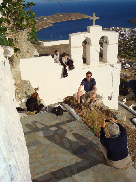 12 mai 08 : séance photo dans la Chora de l'île de Sérifos... Au deuxième plan, un mannequin et une équipe de magazine de mode au travail. Au premier plan, un équipage belge de navigateurs qui les imitent. En toile de fond, la baie de Livadhi où Anegada est mouillé.