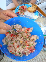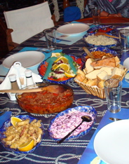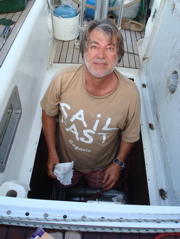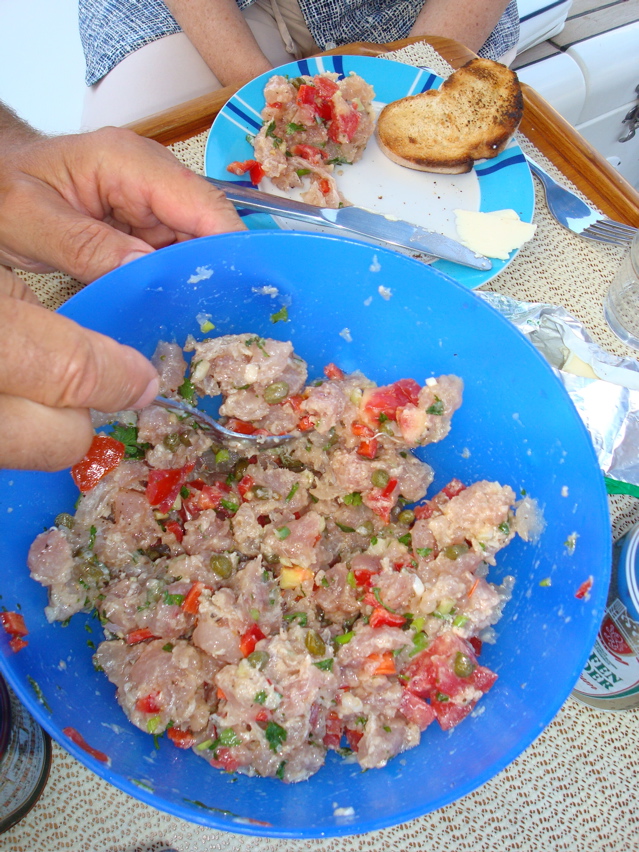 1er septembre 2008 : Enfin ! La traversée de la Crète au Péloponnèse s'est révélée fructueuse. Un thon a enfin mordu au rapala entre les îles de Anticythère et Cythère. Edgar et Dorly nous ont portés chance. Nous avons donc renoué avec le traditionnel tartare de thon.