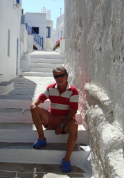 9 juin 2008 : Avec ses crocs bleus, Pierre est bien accordé aux ruelles grecques.
