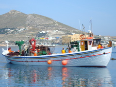 19 mai 08 : les pêcheurs grecs reviennent avec plus de caisses vides que de caisses pleines. On ne voit pas beaucoup de poissons dans ces eaux tranparentes et turquoises et, au marché, il est aussi rare que cher. Du coup, après avoir fait une cure "poisson sans cochon" en Tunisie, On fait "cochon sans poisson" en Grèce ! Pierre a tout de même failli tomber à la renverse quand, sur une plage de Sérifos, il a observé une dame pêcher le loup avec un simple fil et un hameçon au bout. Elle en sortait un de 400 à 500 g toutes les 5 minutes ! Ils s'étaient peut-être échappés d'un élevage !?