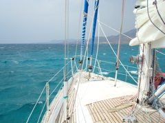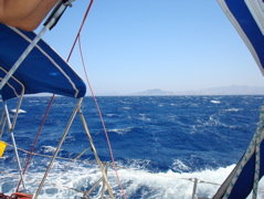 11 août 2008 : Nous avons retrouvé le meltem dans toute sa splendeur ! Nous en étions un peu protégés entre Marmaris et Antalya mais en remontant sur Datça aujourd'hui, il est monté jusqu'à 40 noeuds dans les rafales. L'extrémité des goussets de lattes de la nouvelle grand'voile n'ont pas supporté. Du coup on doit remonter jusqu'à Bodrum pour faire réparer tout cela !