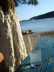 Une petite plage, une taverna avec ses tables et chaises en bois à l'ombre des tamaris... fin d'après-midi tranquille sur Sifnos. Ce n'est pas qu'on apprécie tellement l'ouzo, mais parfois il s'impose naturellement.