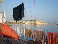 24 août 2008 : Voici une semaine que nous sommes au port de Rethymon avec la "Forteza" en toile de fond aussi bien à l'heure de la lessive qu'à l'heure du coucher de soleil ! Nous avons loué une voiture pendant 3 jours avec Gisèle et Georges de Samirena pour aller à la découverte de la Crète. Mais quelle chaleur !!!