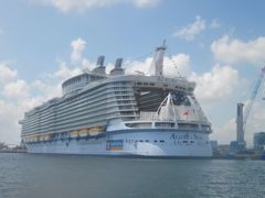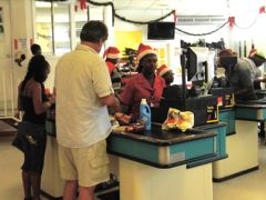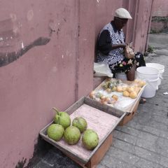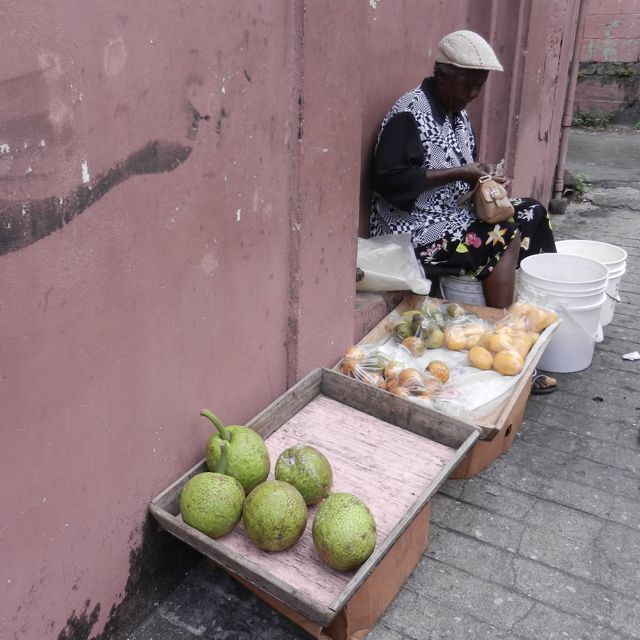 Mercredi 14 décembre : Bon, d'accord, chacun le sien (cliquez pour voir le nom du paquebot), c'est mieux comme ça ! Mais je ne suis pas certaine que les habitants du monstre qui cache à moitié St-Georges aient le plaisir de faire leurs courses auprès des petites marchandes et de tester chaque jour une recette différente avec les fruits et légumes locaux, par exemple les fruits à pain qui sont au premier plan.
