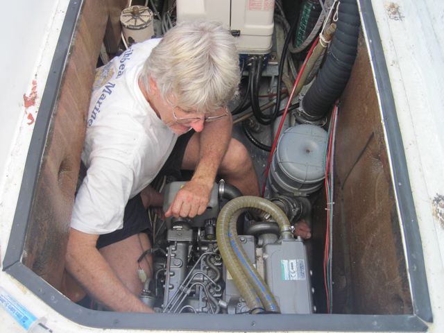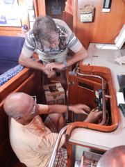 Grâce aux compétences de Fred, électro chez Caraïbe Gréément, la génératrice, en panne depuis décembre, fournit à nouveau du 220 V. Suite à notre passage aux USA, elle produisait de l'énergie, mais seulement du 160 à 200 V. Fred a repris le circuit électrique à zéro et simplement décroisé des fils qui, à force de manipulations par divers électriciens, avaient fini par faire du macramé !