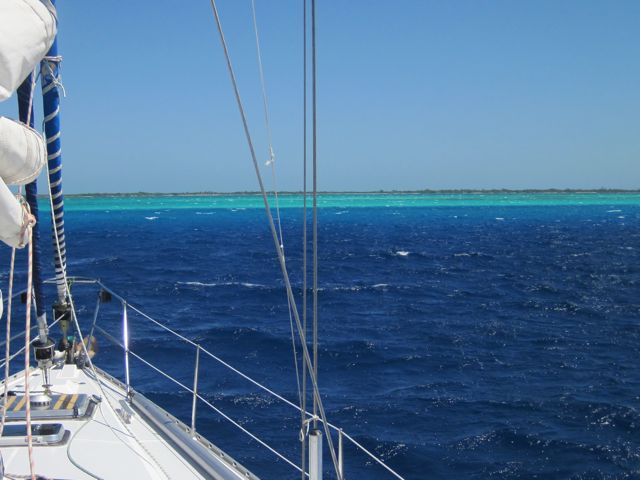 J'écris depuis l'atoll de Chinchorro, au Mexique. Pour la première fois, nous avons mouillé au milieu de la mer ! Rien à l'horizon, ni île, ni bateau... pourtant sous l'eau, la barrière de corail est à 10 m sur notre arrière. Elle nous a permis de passer avec juste 3 à 4 m de hauteur d'eau et de nous mouiller dans le sable blanc qui rend l'eau bien turquoise. Pas besoin de cartes (elles sont fausses par ici !), on se dirige à la couleur de l'eau. Mais la protection est mauvaise et le mouillage bien rouleur !