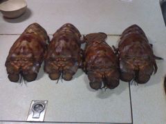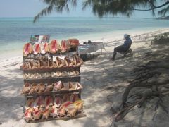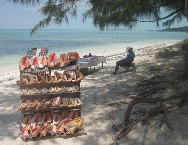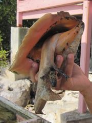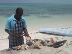 Vendredi 13 mai : Les Turks et Caïcos, comme leurs voisines les Bahamas, sont le pays du "conch", lambis en français. Ce mollusque qui devient rare aux Petites Antilles, est encore ici la base de l'alimentation, du moins dans les restaurants, même s'il est aussi menacé par la surpêche. Dans ce petit bar sur la plage, la fraîcheur du produit est assurée puisque le cuisinier sort les bêtes de leur coquille devant nous. C'est une technique un peu difficile, que Pierre maîtrise maintenant bien, que de couper le muscle qui retient fermement le lambis à sa maison. Si aux Antilles, on le mange principalement en fricassée, ici les recettes sont plus variées : conch fritters (accras), conch crackers (beignets), conch chowder (soupe), conch salad. Sur Anegada, j'ai cuisiné un ceviche de lambis à la mode mexicaine... délicieux