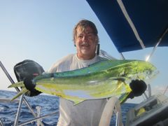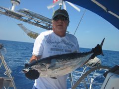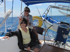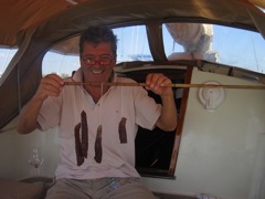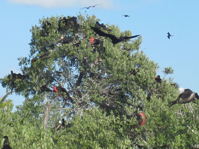 Lundi 14 mars 2011 : Ma maman nous a rejoints à Isla Mujeres, en face de Cancun. Comme la côte mexicaine est loin d'être un paradis pour la croisière, défigurée par le tourisme de masse, c'est à Isla Contoy, une réserve naturelle, que nous lui faisons prendre l'air... et la mer. Comme vous pouvez le voir, Pierre n'a aucun respect pour sa belle-mère... mais il lui a tout de même pêché deux beaux thazards. Nous nous régalons de balades sur le petit bout d'île qui nous est autorisé et de l'observation des frégates en train de nicher.