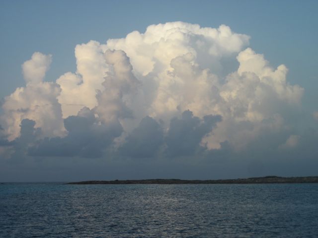 Vendredi 6 mai : Nous arrivons juste pour l'anniversaire du capitaine aux îles Turk et Caicos après 8 jours de navigation intensive, au près, en slalomant entre les îles des Bahamas. Comme le temps nous est compté avant le début de la saison cyclonique et que le prix d'entrée aux Bahamas est prohibitif pour y faire juste un ou deux arrêts, nous regardons les îles de loin et nous reposons parfois à l'abri d'une d'entre elle pour une nuit tranquille avec notre pavillon jaune hissé. Nous profitons tout de même de ses belles eaux turquoises, de quelques nuages impressionnants et de la pêche miraculeuse ! Mais pourquoi cette route difficile à l'est ? Voir la rubrique "Et après ?"