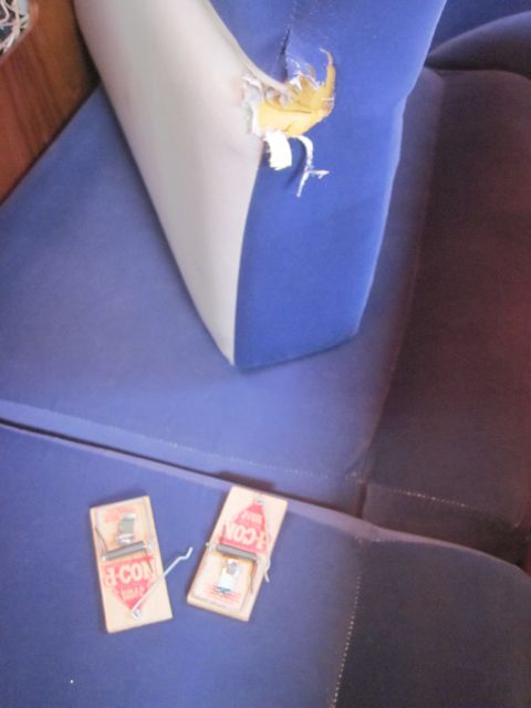 Vendredi 20 mai : Nous continuons la découverte de la faune de l'île avec la visite inattendue à bord d'un ou plusieurs rats. Nous avons d'abord trouvé quelques crottes et des paquets de biscuits grignotés. La nuit, nous avons entendu du remue-ménage dans les placards et vu les dégats au coussin du carré. Comme il semble qu'ils quittent les lieux la journée, nous avons, la nuit suivante, fermé tous les hublots et la porte, et mis des trappes. Personne à l'intérieur cette fois-ci heureusement, mais la trappe à l'extérieur a fonctionné. Trop petite, elle a dû juste pincer un bout de moustache. Par contre nous avons vu l'intrus se sauver, se cacher dans la baille à mouillage où nous l'avons aspergé de spray au poivre ! 12 cm de long (sans la queue), gris-brun avec de jolis yeux... J'ai oublié de prendre la photo ! Une heure après, il recommençait son manège. Cette fois-ci, on a testé le spray anti-moustiques à haute dose. Il s'est sauvé le long des amarres... jusqu'à la prochaine ! Le bateau voisin, Suisse aussi,a vécu la même expérience. Les rats doivent penser que nous sommes des greniers à fromage ! Plus qu'une nuit à supporter cela (avec des bouteilles plastiques coupées sur les amarres pour essayer de l'empêcher de monter à bord), puisque grâce à Mike, super mécano, notre moteur fonctionne à nouveau (voir Histoire d'O). Demain on quitte enfin les Turks et Caïcos, direction Puerto Rico.