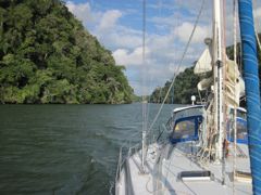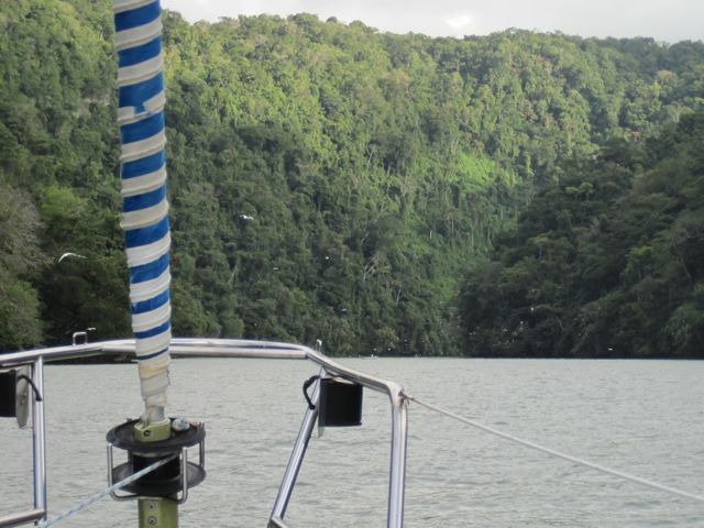 Et oui ! Nous sommes en eau douce ! Nous avons passé (difficilement) la barre à l'entrée du Rio Dulce, au Guatemala et l'avons remonté sur une trentaine de kilomètres, jusqu'à l'embouchure du Lac Izabal. Le paysage est somptueux et nous profitons d'une cure de chlorophylle pendant qu'Anegada se refait de beaux dessous au chantier Abel.