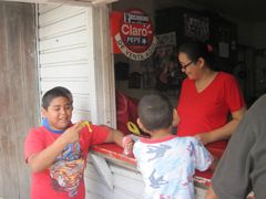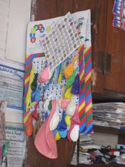 Mercredi 26 janvier 2011 : C'est les vacances pour les enfants de Guanaja qui n'ont pas beaucoup de distractions. Quand ils ont gagné ou reçu un petit sou, ils viennent à l'échoppe du coin (celle où nous buvons notre café !) et jouent à la loterie : ils choisissent un animal imprimé sur un petit rond (carte en haut de la photo centrale) . La vendeuse regarde le numéro caché écrit derrière le rond et donne le ballon correspondant. C'est le suspens... grand ballon, petit ballon, ballon long, énorme ballon !