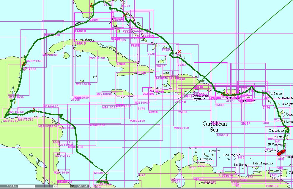 Jeudi 14 juillet : Après les Grenadines dépendant de St-Vincent, nous voici aux Grenadines dépendant de Grenade, à Carriacou pour être précis ! Nous arrivons à notre but... L'an dernier, nous étions à Panama à la même période et nous apprécions cette année le climat plus ventilé des Petites Antilles. Depuis notre départ de Panama au mois de décembre, après notre retour de Suisse (le trait vert en travers !), nous avons parcouru 3650 nm, soit 6760 km. Nous avons bien mérité de traîner un peu d'île en île avant de revenir en Suisse dans un mois. Du coup nous nous sommes mis au régime pour préparer les excès de fromage et chocolat à venir !