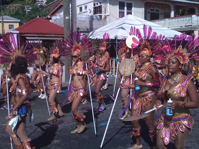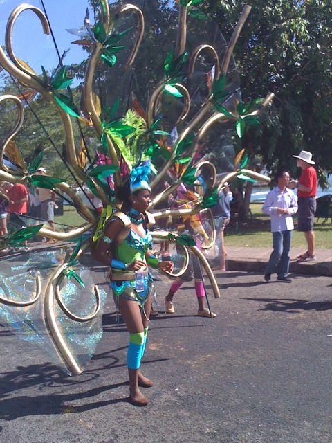 Mercredi 10 août : Anegada est hors de l'eau au chantier de Grenada Marine. Ces derniers jours, entre les nettoyages, rangements et préparation du bateau, nous avons un peu profité du carnaval local. Les parades se sont succédées lundi : la première, en fin de nuit, pour laquelle les participants se couvrent d'huile moteur ou de peinture (joli diaporama de l'an dernier trouvé sur youtube), la seconde très colorée et la troisième, de nuit à nouveau, avec force lampes fluorescentes. Toutes les trois se font au rythme endiablé du calypso diffusé par des piles de gros haut-parleurs entassés dans des camions. Les cris/hurlements des DJ encouragent les danseurs. Tout ce qu'on aime !