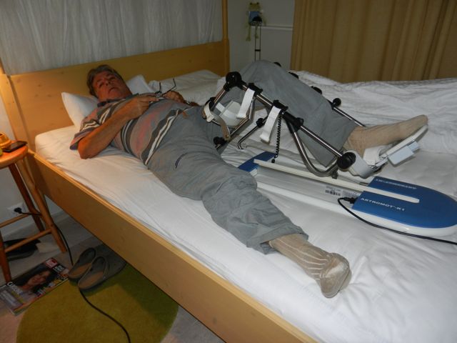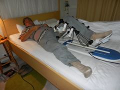 Dimanche 18 septembre : Premier jour de pluie... et c'est le jour que je choisis pour photographier notre vie de chalet... au bord du lac ! Il faut bien inaugurer le nouvel appareil photo, et vous montrer Pierre en plein travail. La "kinétec" lui permet de récupérer progressivement l'angle de flexion de son genou, ceci en plus de la physio traditionnelle. Il en est à 85 ° et devrait arriver à 110° minimum ! Il y a encore du boulot !