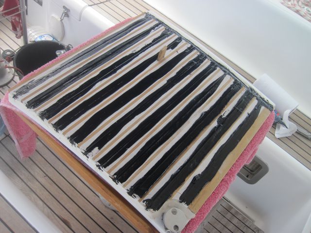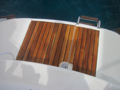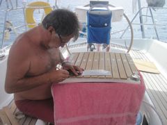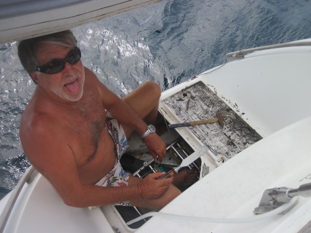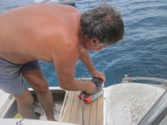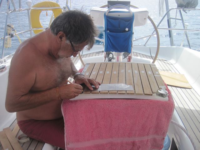 Dimanche 26 juin : Plus de panne... pas de grande découverte à terre... alors Pierre attaque les grands travaux : refaire le teck de la jupe.
