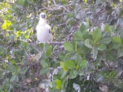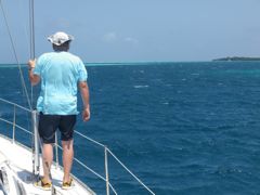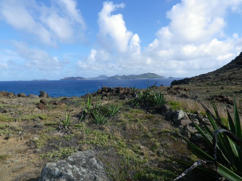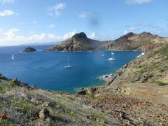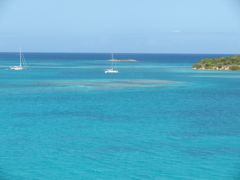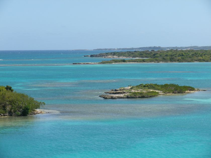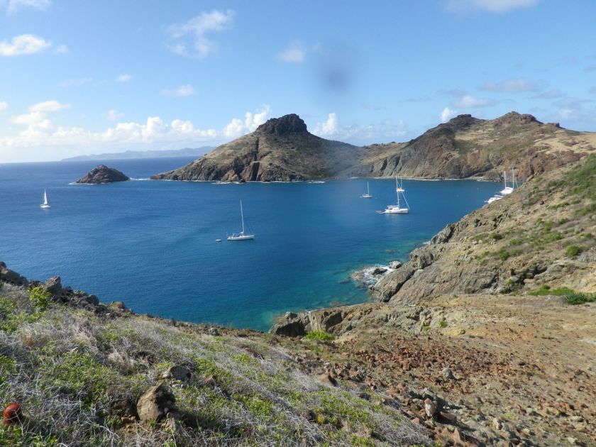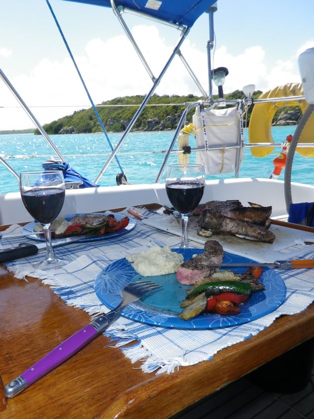 Jeudi 13 février 2014 : Nous avons passé une semaine turquoise dans les eaux du nord-est d'Antigua. Cela valait une montée au sommet du mat pour quelques photos. Ce lagon est pratiquement désert, à part quelques bateaux de touristes qui font un bref passage. Les pélicans nichent sur un des îlots et j'ai passé du temps aux jumelles à les observer. Et dans ce paradis pour langoustes devinez ce qu'on s'offre ? Une côte de boeuf ! Achetée au marché à la viande de St-John et rassie cinq jours au frigo ! Un délice !