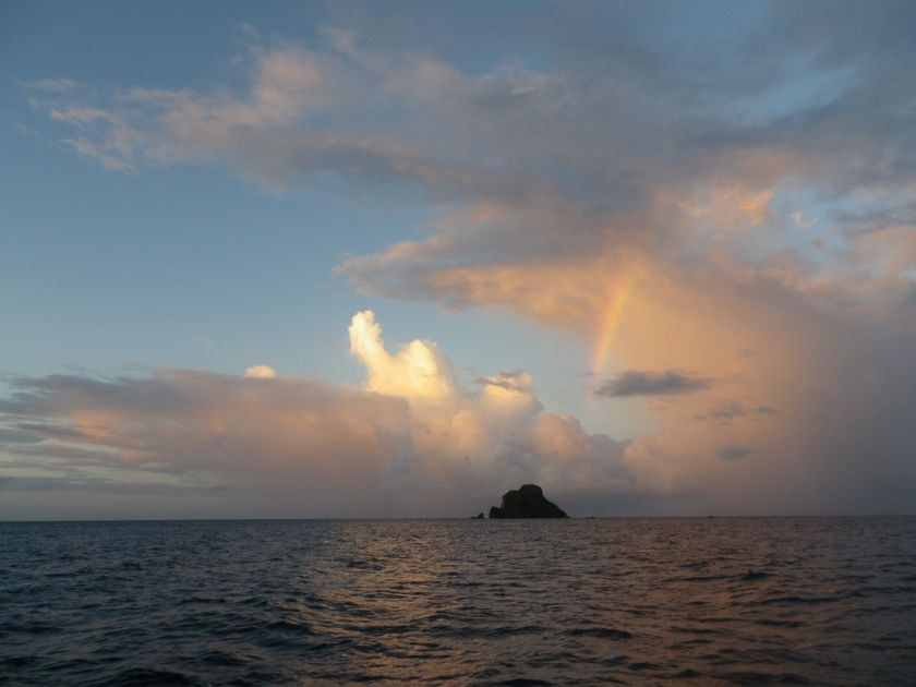 Mardi 4 février 2014 : Nous voici à Antigua ! Après toutes ces réparations, nous avons enfin le sentiment d'être en croisière et de retrouver des endroits moins surpeuplés. L'île Fourchue d'abord, proche de St-Barth, où nous avons passé deux jours paisibles à snorkeller et, pour moi, prendre (un peu) d'altitude. Les grains se succédant ces jours, nous avons eu des couchers de soleil magnifiques. C'était moins drôle dans la remontée sur Antigua : 80 nm de près serré, heureusement sur un seul bord, dans de belles vagues avec toujours ces menaces à l'horizon. Nous avons même ressorti les cirés ! Mais les grains nous ont finalement majoritairement évités et nous n'avons pris le deuxième ris qu'une seule fois. La belle surprise du jour, c'est ce troupeau de dauphins qui nous ont rejoints, en sautant dans un superbe ballet par dessus les vagues, pour venir jouer à l'étrave. Je désespérais d'en revoir un jour... et malheureusement la mer était trop forte pour aller les observer à l'avant. Nous nous sommes contentés de les regarder s'arrêter à côté de nous, puis repartir pour rattraper le bateau en surfant les vagues.