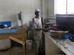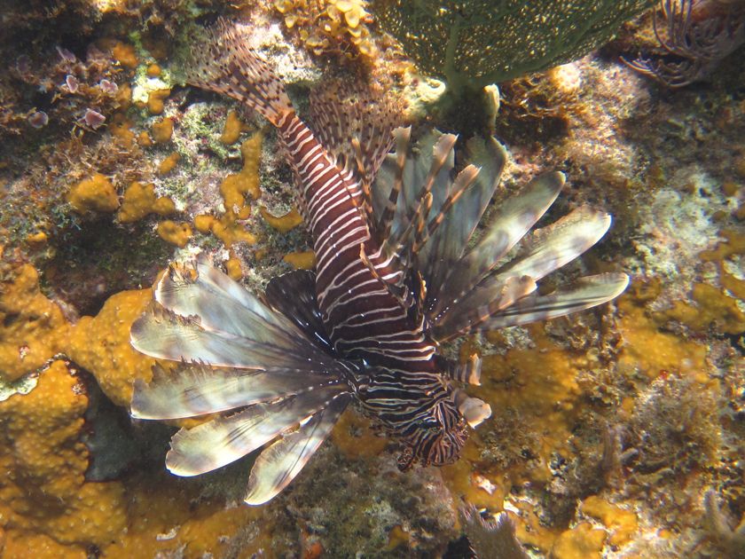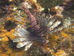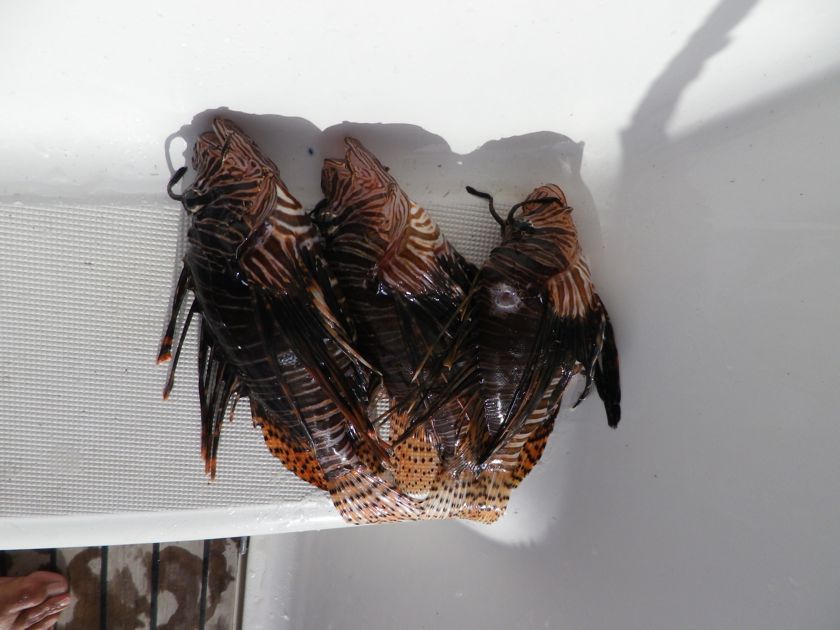 Lundi 13 janvier 2014 : Nous avons cuisiné nos premiers "lion fish" ou "rascasse volante". Ce poisson du Pacifique envahit l'Atlantique à une vitesse redoutable et il fait des ravages dans les récifs car c'est un glouton qui mange tous les bébés poissons autour de lui. La chasse est donc ouverte et, pour une fois, souhaitée. Mon prédateur peut s'en donner à coeur joie et, si cela fait longtemps qu'il les massacre, on va à l'avenir en profiter. Un article paru dans un journal de la Martinique, où il commence à apparaître dans les restaurants, a fini de nous convaincre. Je suis Pierre en annexe pour qu'il puisse y déposer ses proies au fur et à mesure puis, quand les poissons ne bougent plus, je m'équipe de gants épais et de ciseaux pour couper toutes les épines fortement vénimeuses. Quelques coups de couteau pour tirer les filets et on se régale.