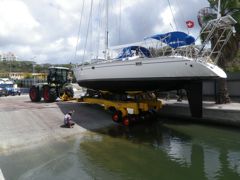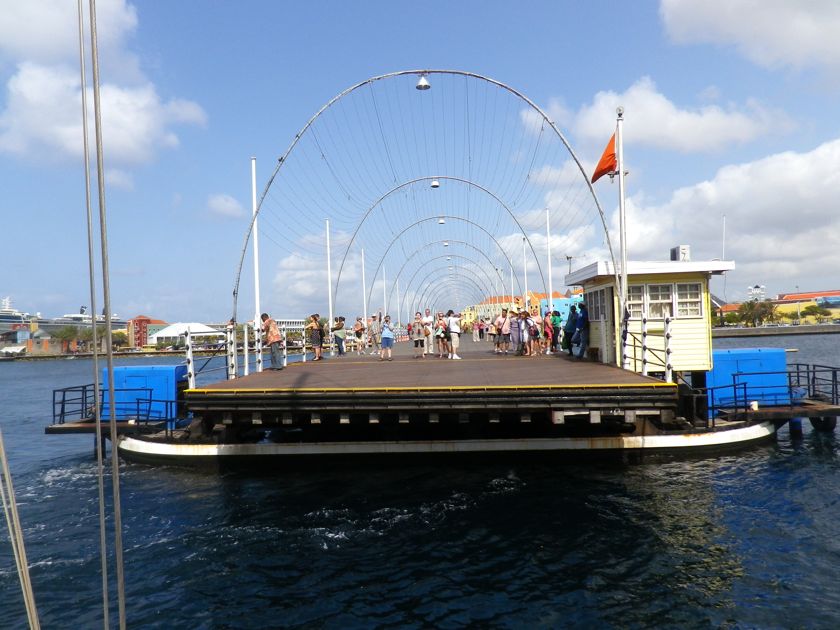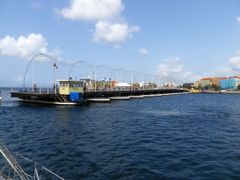 Mercredi 26 mars 2014 : C'est la dernière étape de cette courte saison de navigation : Nous quittons le lagon de Spanish Water et entrons dans celui de Willemstadt où se trouve Curaçao Marine, le chantier où nous sortons le bateau. Pour cela, nous devons demander l'ouverture du pont flottant, ce qui se fait très simplement par VHF. Du coup le flot des touristes s' interrompt et nous sommes l'attraction générale. A droite, côté Punda, il reste un moignon de pont et à gauche, côté Otrobanda, c'est le pont entier qui pivote, emmené par un gros moteur sur le dernier flotteur (dans les caisses bleues). Et maintenant, au travail... rinçage, lessives, rangements, valises... etc... et sortie du bateua par un moyen inédit !