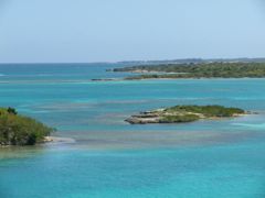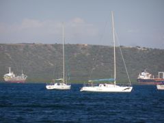 Vendredi 1 janvier 2015 : Bonne Année à tous depuis Salinas, au sud de la République Dominicaine. Nous sommes dans une grande baie fermée, au mouillage devant un joli hôtel où nous avons passé le Nouvel An avec l'équipage du seul autre bateau habité du coin, Thomas et Maria, venant d'Autriche. Les montagnes, au nord, nous offrent un superbe paysage et calment heureusement l'alizé pendant la nuit. Nous avons cru, en arrivant, pouvoir régater en Jod mais ces deux bateaux, appartenant au proprétaire de l'aéroport Las Americas, pourrissent dans la baie sans que personne ne les utilise. Il y aussi l'ex-Primagaz au ponton de l'hôtel, tout aussi abandonné ! Dommage !