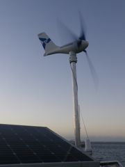 Dimanche 26 janvier 2014 : Notre éolienne Aero6Gen a porté nos couleurs fidèlement pendant 7 ans avant de plonger dans le canal de la Dominique. Tout le monde s'extasiait de son silence, ce qui est une qualité rare pour une éolienne. Malheureusement l'Aerogen est maintenant fabriquée en Chine (ça vous étonne !!!???) et le vendeur nous a carrément envoyés chez la concurrence, nous disant que lui ne voulait plus les vendre car elles ne sont pas fiables ! Après un tour de plan d'eau à écouter les différents autres modèles nous nous décidons pour la Silentwind . Après un montage complet et attentif (on a dû retourner au magasin car il manquait une pièce dans le carton !), elle ne fonctionne pas ! On la démonte et on la ramène pour constater qu'on nous a vendu une ancienne version (au prix de la suivante !) abîmée. Finalement on nous donne la troisième version (car il n'y a plus de deuxième en stock... vous suivez !!!). On réinstalle pour constater de fortes vibrations dans tout le portique... Reste à retourner dans cet horrible café internet à Grand Case ;-))) pour chercher des solutions : Couper un bout du mât ? Installer de gros silentblocks ? Changer les pales ? Décidement c'est une année bricolage ! Heureusement que les bars de Grand Case nous consolent à l'heure du Ti-punch !