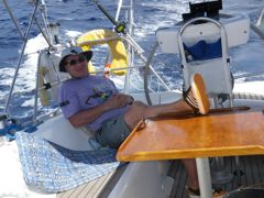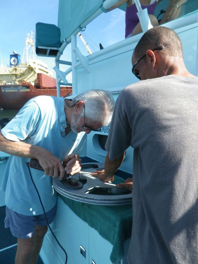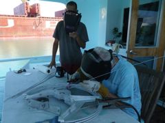 Samedi 13 décembre 2014 : Voici notre sauveur ! Captain John sur son bateau construit de ses mains, Second Star. A peine arrivés dans le mouillage de Barahona avec notre problème de barre qu'il nous annonce être un spécialiste de la soudure. Incroyable ! On ne pouvait pas rêver mieux ! Il devait faire un saut aux USA pour aller chercher des pièces électroniques... mais aussitôt revenu, il a attaqué notre secteur à la meuleuse puis à la soudure, assisté de Alexis, le marinero dominicain qu'il est entrain de former. Tout cela s'est terminé par un apéro multiculturel sur Anegada ! We are improving our english y nuestro español tambien ! Du coup on est prêt à repartir sur Haïti pour parler un peu français !
