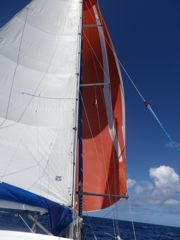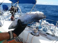 Jeudi 20 février 2014 : Le retour sur St-Martin s'est joué à quitte ou double... ou plutôt demi ou double !!! Nous avons dû partager un thazard avec un requin mais par contre nous avons fait le doublé de thons quelques heures plus tard. Les deux lignes sont parties en même temps... Et pour la première fois depuis deux ans, nous avons pu aérer le spinnaker !