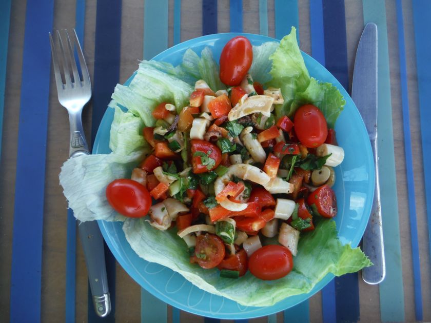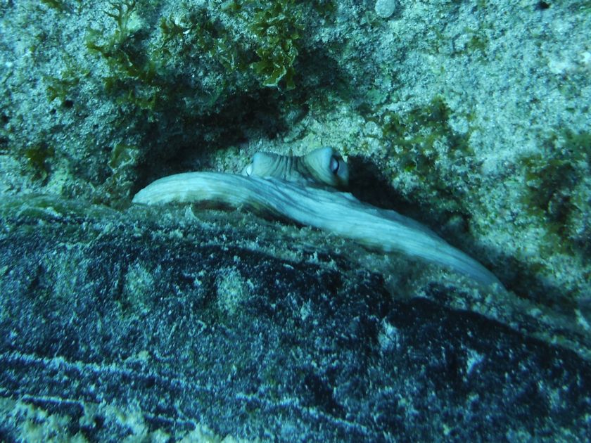 Dimanche 16 novembre 2014 : Nous sommes de retour d'un week-end prolongé sur le joli îlot de Klein Curaçao. Pas de bouchon sur l'autoroute... un joli bord au portant sous génois seul, tranquilles, et nous retrouvons le lagon de Spanish Water pour quelques jours. Nous avons pu profiter de faire de beaux snorkelings et d'inaugurer le nouvel appareil photo sous-marin. Admirez le camouflage de la rascasse... Quant au poulpe, il semble avoir reconnu l'oeil du pêcheur et être terrorisé. Mais c'est son cousin qui a passé à la casserole le lendemain, attrapé à la main ! Et le voici en salade !