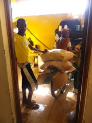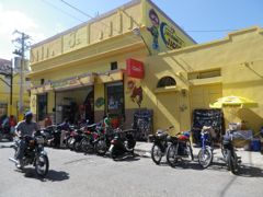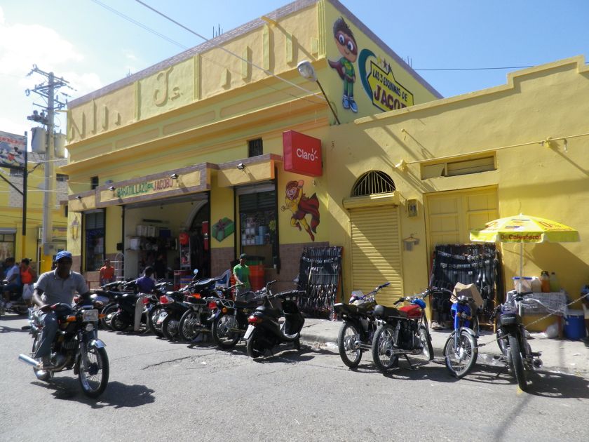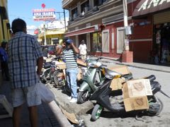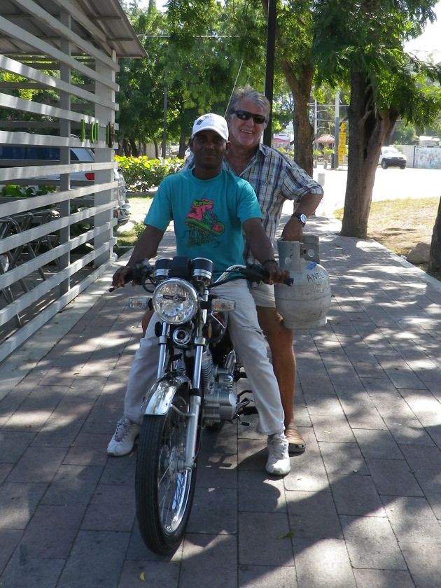 Dimanche 7 décembre 2014 : Nous retrouvons le pays de la moto... La République Dominicaine. C'est le taxi local et bon marché. Il sert aux livraisons... jusque dans la cuisine même ! Et on protège la selle pour éviter les "huevos cocidos" ! C'est ce que Pierre est entrain d'expliquer et de mimer ! Grâce à ce moyen pratique, on a pu remplir rapidement notre bouteille de gaz !