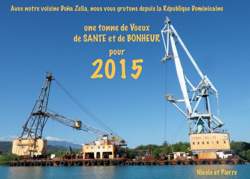 Ma carte de voeux est un peu particulière cette année! Mais à Barahona, où nous sommes restés bloqués quelques temps, Doña Zelia et son chevalier servant lui faisant la révérence a été notre repère, notre sapin de Noël, notre décor sur fond de ciel rougeoyant à l'heure de l'apéro, notre vigie nous surveillant de son projecteur la nuit, et surtout notre compagne SILENCIEUSE... ce qui est si rare dans ce pays !