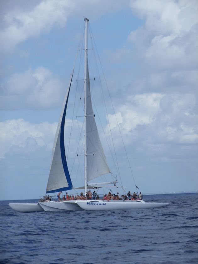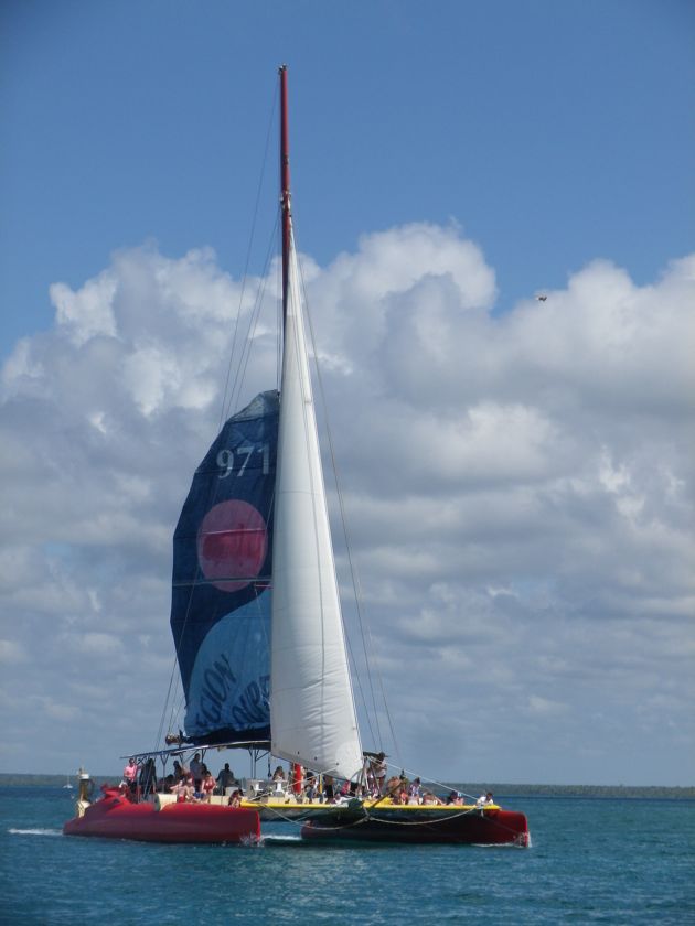 Jeudi 19 février 2015 : C'est la fin de notre séjour dominicain... Nous partons ce soir pour Puerto Rico et plus si vent favorable. Nous avons passé deux jours aux environs de l'île Saona, paradis de cocotiers pour les touristes qui sont déposés chaque jour par une armada de gros catamarans et des lanchas puissantes. Nous avons compté jusqu'à 23 catas et autant de lanchas... soit environ un millier de personnes chaque jour ! Quelques vieilles gloires de la course au large mènent ici une retraite active : Région Guadeloupe, Kriter et Royale, pour qui les choses se sont mal terminées lors du coup de vent d'ouest, inhabituel à cette saison, de la semaine dernière.