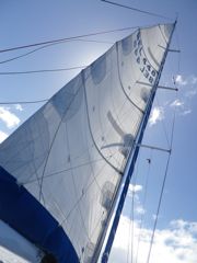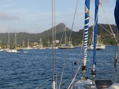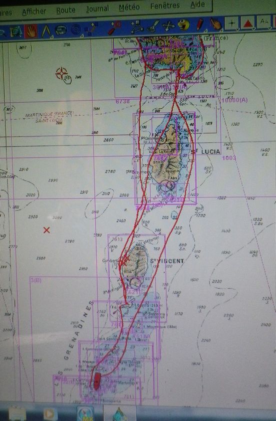 Trève de plaisanterie, voici l'histoire vraie : Notre grand'voile était fatiguée et elle n'a pas du tout aimé la traversée dans une mauvaise mer entre les BVI et St-Martin. Elle a explosé de désespoir et les voiliers l'ont déclarée irréparable ! Nous qui nous réjouissions de mettre un peu de sud dans notre cap et de pouvoir enfin naviguer à la voile, après 600 nm appuyés au moteur plein est, nous ne supportons pas l'idée de descendre jusqu'à Grenade sans grand'voile. Heureusement, St-Martin est un coffre aux trésors pour les réparations et occasions diverses. Et nous trouvons notre bonheur... belge ! Une ancienne voile de régate aux dimensions quasi parfaites qui nous permet un beau bord musclé de 160 nm jusqu'aux Saintes. Les bouées de passage s'appellent Eustatia, St-Kitts, Nevis et Montserrat, qui nous salue d'un long grain à 35 noeuds en pleine nuit ! Mais le bilan final est qu'on aime encore la voile ! On commençait à en douter !