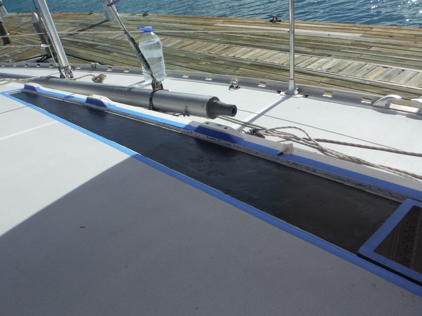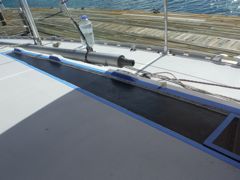 Dimanche 18 janvier 2015 : Petit bilan de l'avancement des travaux... les hublots zénitaux avaient été condamnés il y a deux ans mais il y avait toujours des infiltrations. Les trous ont donc été remplis de résine, recouverts d'une couche de fibre polyester puis de mastic. Puis peinture noire et repose des plexis juste pour le look (et parce qu'ils nous avaient couté la peau des fesses et qu'on n'allait pas les jeter !!!). Nous avons été assistés et conseillés dans ces travaux par "il signore Mirko", un navigateur italien très sympathique rencontré à la marina . Une fois de plus, nous tombons sur la bonne personne au bon moment ! Et c'est l'occasion d'essayer péniblement de ressortir notre italien enfoui sous l'espagnol... après l'allemand des jours précédents cela donne un sacré mélange !!!