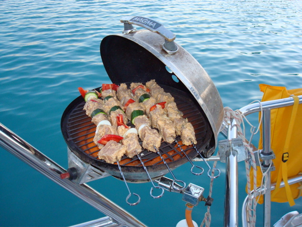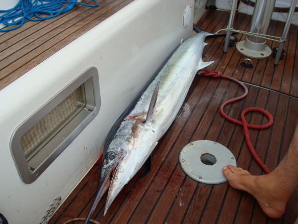 A l'arrivée à Zakynthos, le responsable du port s'occupe de nos papiers d'entrée en Grèce. On lui offre un des tronçons. Cela ne l'empêche pas d'essayer de nous arnaquer et nous faire payer deux fois le transit log. Nos voisins hollandais sont très heureux de recevoir deux beaux filets. Ils viennent nous remercier, nous dire qu'ils n'ont jamais mangé de poisson aussi bon et nous demander des tuyaux pour la pêche. C'est fou le nombre de personnes qui nous disent essayer de pêcher mais ne jamais rien attraper. On ne s'improvise pas pierre-pêcheur !