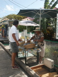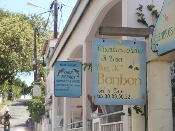 Mais surtout, vous côtoierez les habitants de l'île, parfois blancs, parfois noirs ou métis, mais parlant toujours le même créole chantant. Comme tout le monde se déplace à pied, ou éventuellement en scooter, les rencontres sont fréquentes. Les Saintes ayant un climat sec, elles n'ont pas eu de plantations, donc pas d'esclaves et la population locale descend de pêcheurs bretons. Vous verrez les femmes vendre les tourments d'amour (pâtisseries) à l'arrivée de ferries, le petit vieux proposer chaque après-midi devant sa maison son flan de giraumon ou de patate douce, la vendeuse de sorbet coco, les étalages de punchs et petits pâtés ou de coquillages et bibelots divers. Le matin, les pêcheurs vendent leur poisson sous les arbres en bord de mer. Vous admirerez aussi les jolies enseignes de studios et de chambres à louer dans tous les coins de l'île. Dans les boutiques, vous trouverez des habits et des bijoux de confection locale. Cela change du "made in China". |