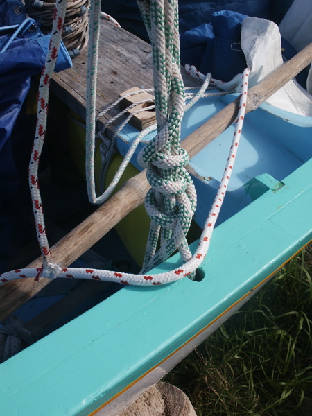 | Au niveau de l'accastillage, seules quatre poulies simples sont autorisées pour l'écoute de grand'voile. Pas de poulie pour le foc, pas de taquet coinceur, winch, manille ou mousqueton en métal à l'exception des bagues pour endrailler le foc. La grand'voile est fixée par des anneaux en liane sur le mât et sur le gui en bambou. Etai et haubans sont en corde. Le stick de barre est interdit également et pour permettre le rappel indispensable au près, le barreur utilise une estroppe. Les voiles ne sont pas lattées. Girouette et faveurs sont interdites également et cela ne facilite pas le travail au vent arrière ! A cette allure, le foc est débordé à la main ou à l'aide d'un petit tangon en bambou coincé dans les haubans. |