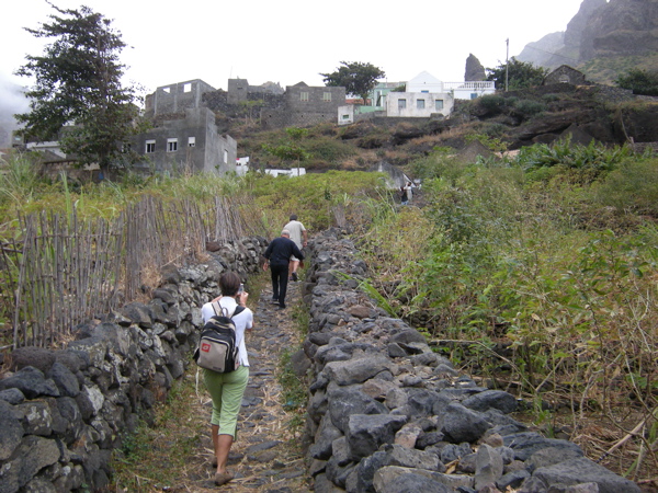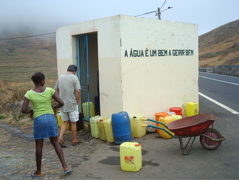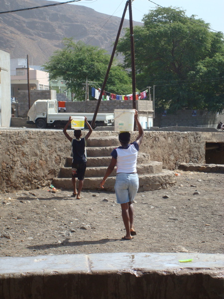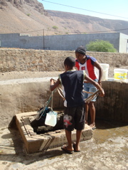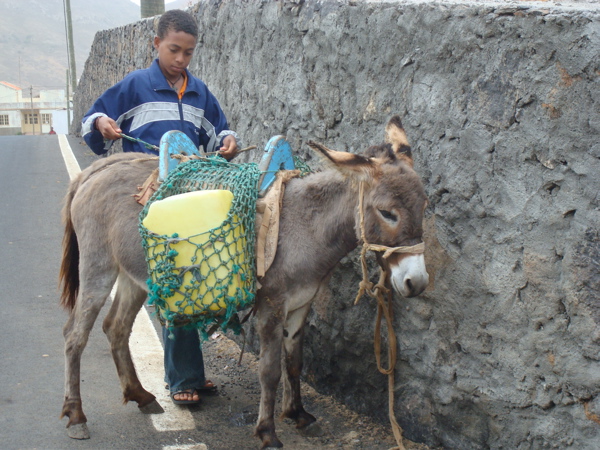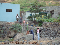 Nous avons la chance de disposer d'une "clé" magique pour nous ouvrir les portes de l'île : Jean-Paul, un ami de Jean-Claude de "1000 sabords", vit à Tarrafal depuis 1996 et connaît tous les recoins, les bons coins et les bonnes personnes ! Il parle le portugais/créole et dispose d'un superbe 4X4 dans lequel il nous emmène sur des routes et des chemins plus tortueux les uns que les autres. Dans la montagne, il s'arrête pour prendre l'eau au chafariz (poste de distribution d'eau) pour remplir son bidon d'eau potable, l'eau de Tarrafal n'étant pas très recommandable. Plutôt qu'un 4X4, les locaux, eux, ont un âne, une brouette... ou leur tête !