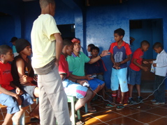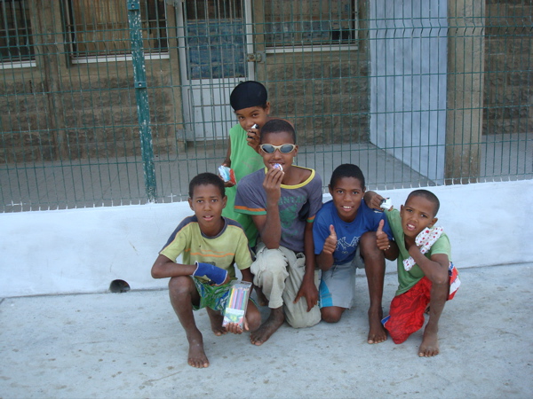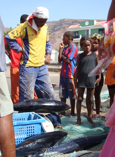 Le jour de Noël, nous distribuons de petits paquets cadeaux aux enfants du port. Nous apprenons petit à petit comment agir avec eux : éviter de leur distribuer bonbons et stylos sans raison, afin qu'ils ne s'habituent pas à mendier, mais les récompenser pour un travail, en veillant à ne pas leur donner trop d'argent pour que les parents ne les envoient pas travailler plutôt que d'aller à l'école. Pas toujours facile de trouver l'équilibre. Comme ils sont une dizaine, nous les désignons à tour de rôle, en précisant bien qui est le gardien du jour. Francili, un jeune pêcheur qui nous a accueillis le premier jour, nous a amenés à la police pour les papiers et a averti Jean-Paul que nous le cherchions (le téléphone capverdien ressemble étrangement à l'arabe !) jette un oeil de temps à autre sur les enfants. et nous signale s'ils montent dans l'annexe. Mais à Noël, le cadeau est permis. Je ne sais pas si les crayons de couleurs, ballons gonflables et autres lunettes de soleil valent à leurs yeux les fausses Barbies et les voitures téléguidées aperçues en ville et dans les magasins chinois, mais ils avaient l'air contents. Ce ne sont apparemment pas les plus gâtés.